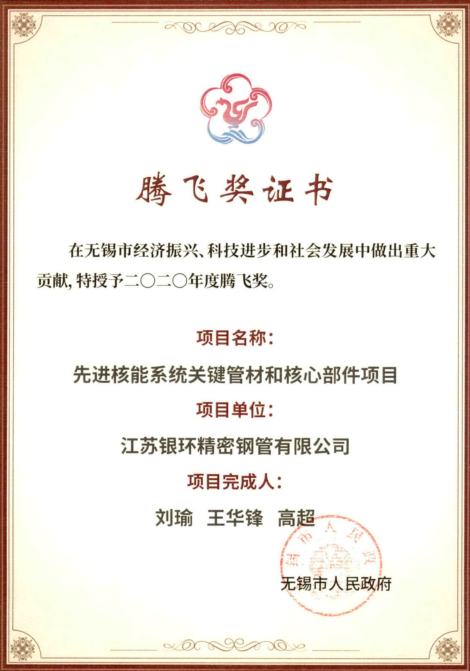 2020年度,该奖项汇集了无锡全市各领域的优秀单位同台竞技,从项目创新能力、技术先进性、知识产权成果、示范应用情况和经济社会效益等多个维度对参评项目进行全面评价。公司参评项目《先进核能系统关键管材和核心部件项目》以国家科技重大专项——大型先进压水堆核电站及高温气冷堆关键管材与核心部件为任务牵引,经过数年攻坚克难,突破了多项技术瓶颈,集成了全流程制管技术,成功研发出先进核能系统关键管材和核心部件,并实现了产业化。项目产品在国内市场占有率位列前茅,核心部件实现独家供货。项目成果成功突破了我国核电发展“卡脖子”的技术瓶颈,打破了国外的技术封锁和垄断,形成了完全自主知识产权,实现了关键核心技术的自主可控,保障了国家重大工程的战略安全,为中国制造在国际竞争中赢得了话语权。