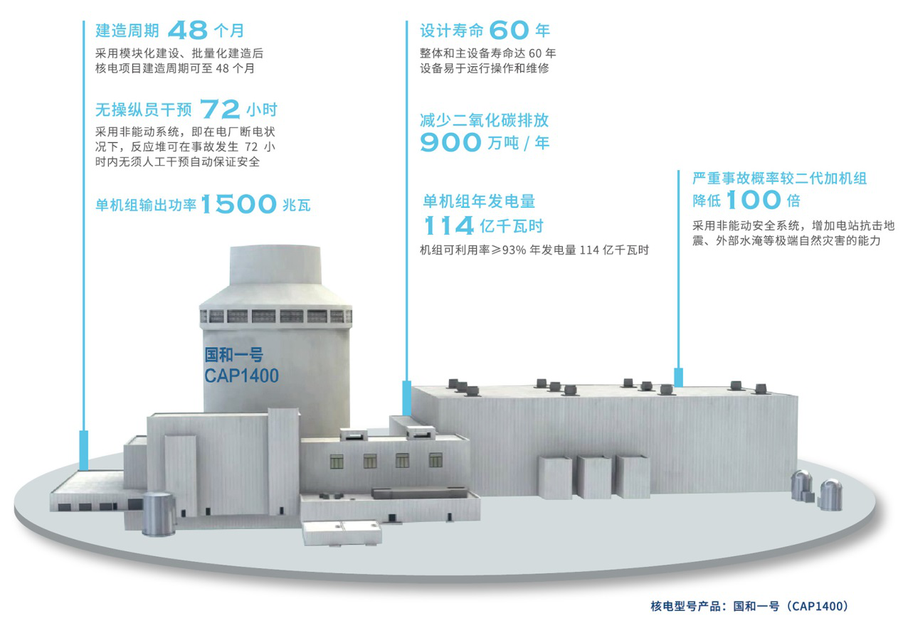 “国和一号”是我国十六个重大科技专项之一,是我国当前已实现自主可控的可规模化建设的*********三代非能动核电技术,由上海核工院牵头研发设计,并承担全厂建设总承包任务,当前已实现自主可控,可规模化建设。“国和一号”单机功率达到150万千瓦,是目前中国自主设计的最大功率核电机组,它的设计寿命达60年,单台机组年发电量可满足超过2200万居民的用电需求,每年可减少二氧化碳等温室气体排放900多万吨,将助力中国新型电力系统建设和“3060”碳达峰碳中和目标实现。