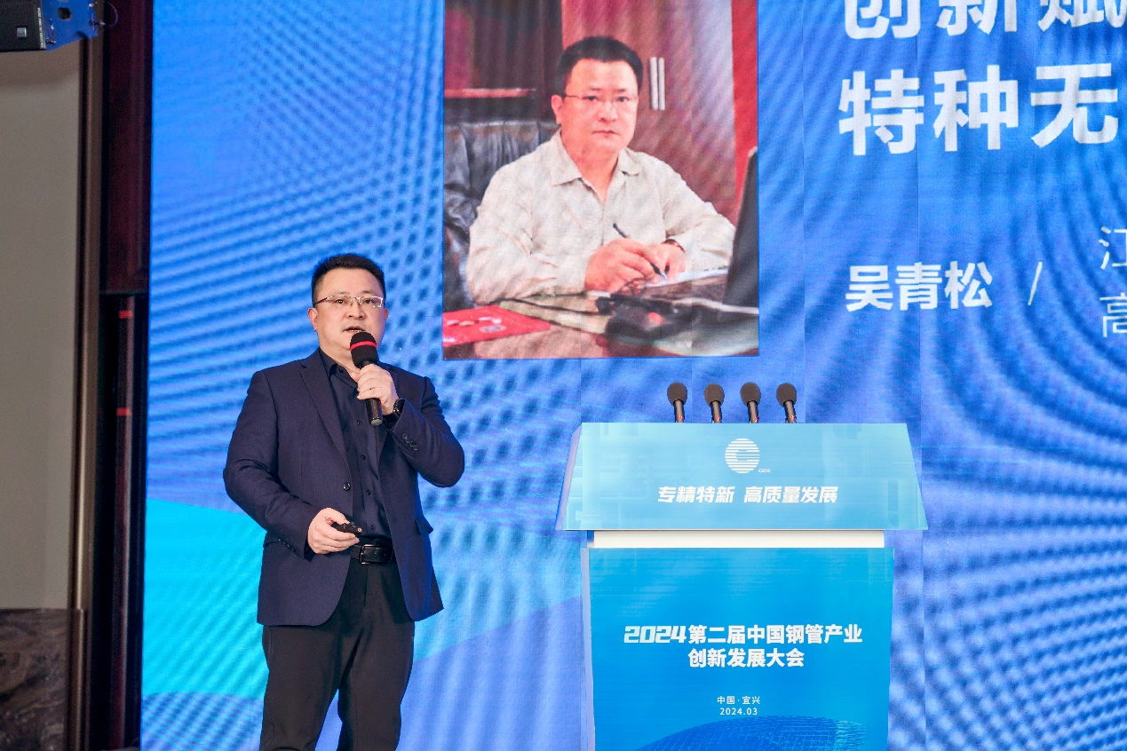 江苏银环精密钢管有限公司副总经理兼总工程师吴青松做题为《创新赋能 品质立身 特种无缝管的专精发展之路》的报告。