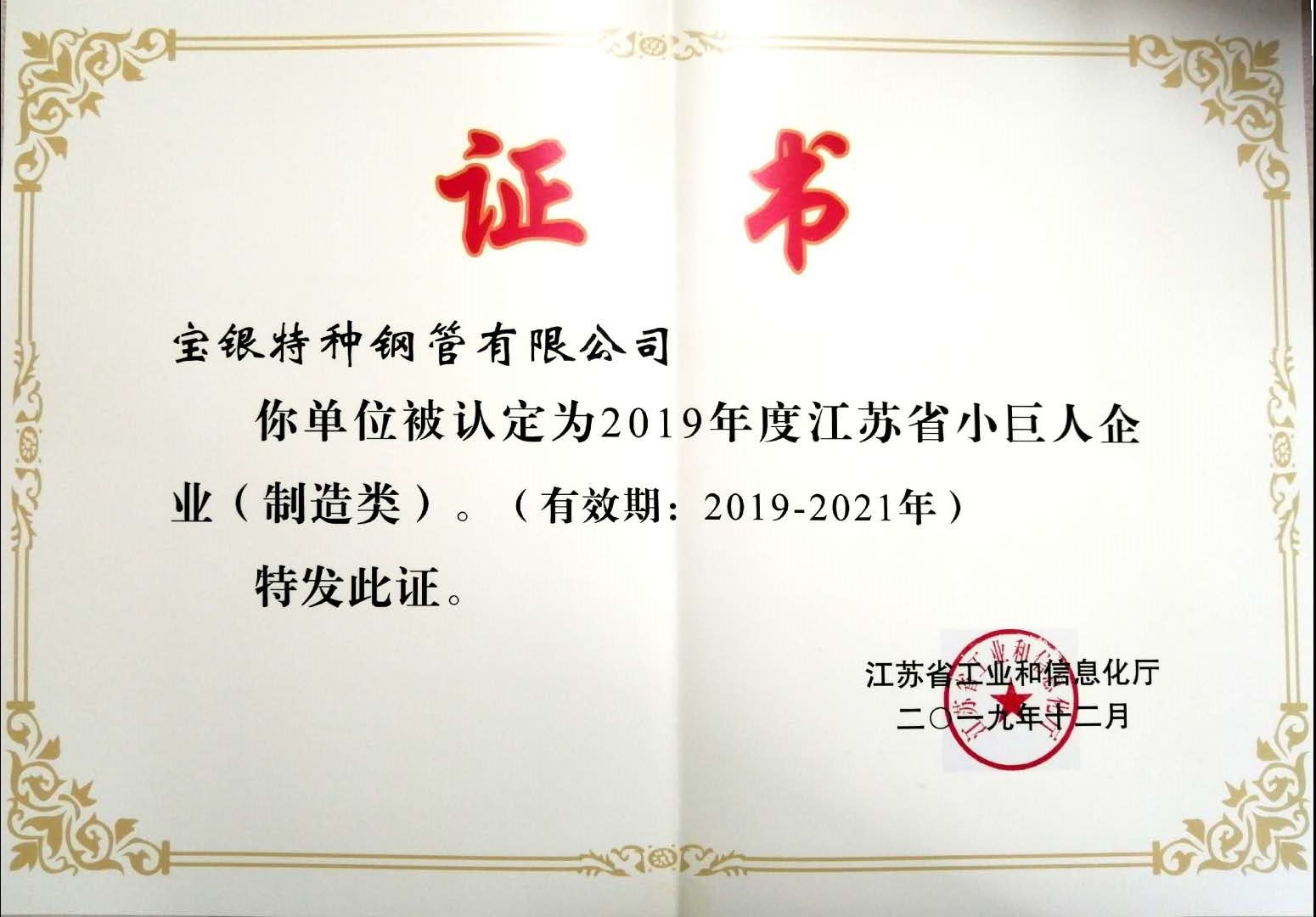 宝银公司通过2019年度“江苏省小巨人企业”认定