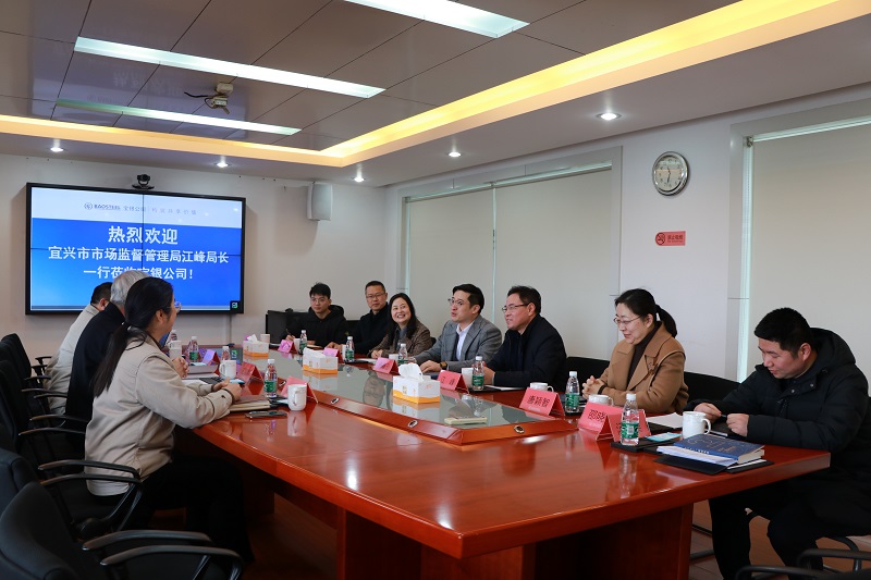 2月9日上午,宜兴市市场监督管理局局长江峰一行调研宝银公司,经开区管委会副主任、芳桥街道党工委书记杨卓云陪同调研,公司创始人、党委书记、总经理庄建新,副总经理吴青松,党委副书记、工会主席汤凤萍,办公室主任洪晨等参加接待。