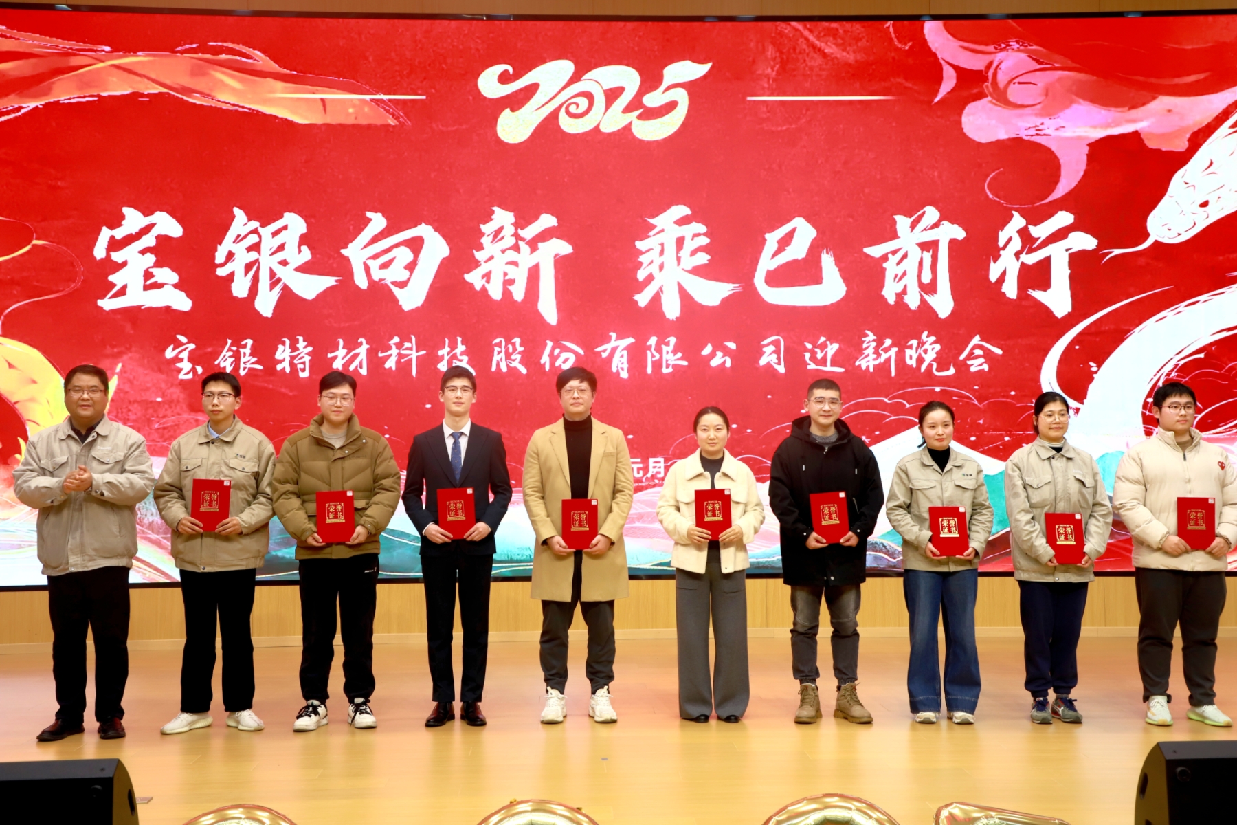 2025年1月16日晚,“宝银向新 乘巳前行”宝银特材科技股份有限公司迎新晚会在公司新报告厅隆重举行。本次晚会由宝银特材工会、团委联合举办。公司创始人、党委书记、总经理庄建新及全体经营班子成员出席晚会,与公司员工们欢聚一堂,同庆新春佳节,宜兴市经开区团委书记张继元特邀参加。